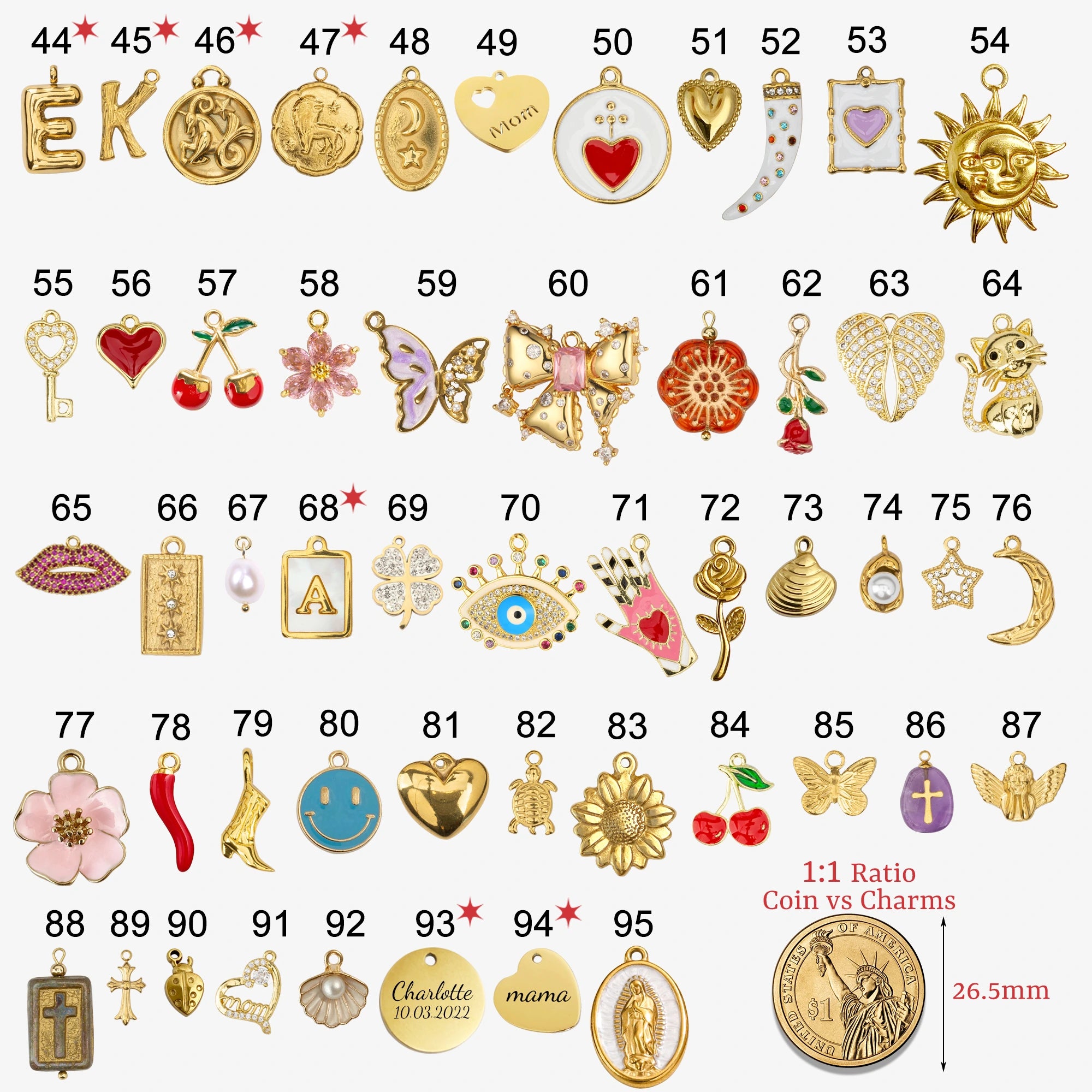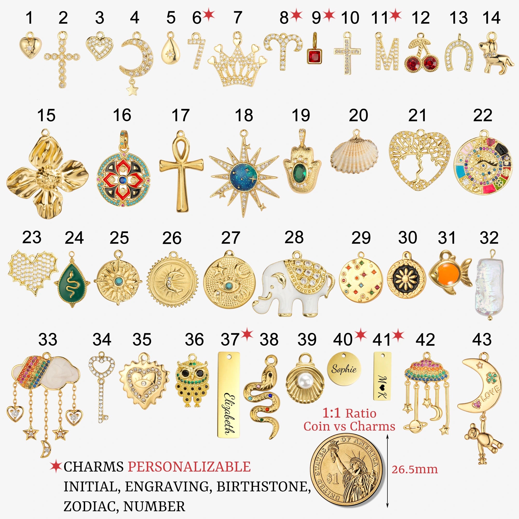 - [Personalized Charm Necklace] You can add remove or move 95 charms around on the chain as you please, Including birthstones, initials, number, zodiac signs, and engravable options. Chain length: 17.5" with a 2" extender (45cm+5cm).