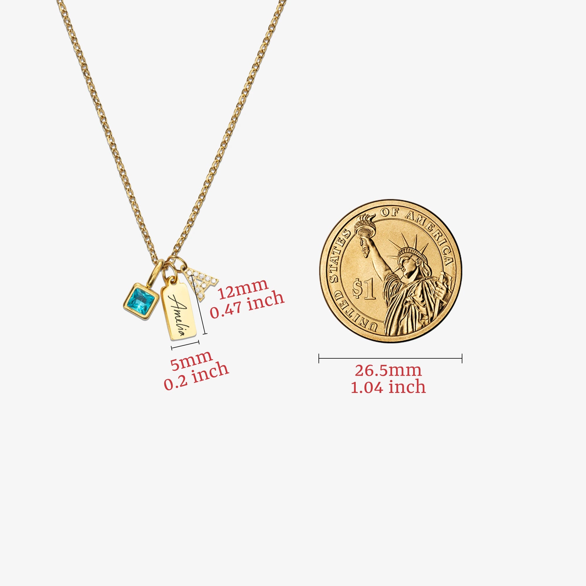 - [Personalized Name Birthstone Necklace Specifications] Name Tag Bar Charm: 0.47" x 0.19" (12mm x 5mm ). Birthstone: 0.22" x 0.22" (5.7mm x 5.7mm ). Intial: 0.24” x 0.28” (6mm x 7mm). Chain length: 17.5" with a 2" extender (45cm+5cm).